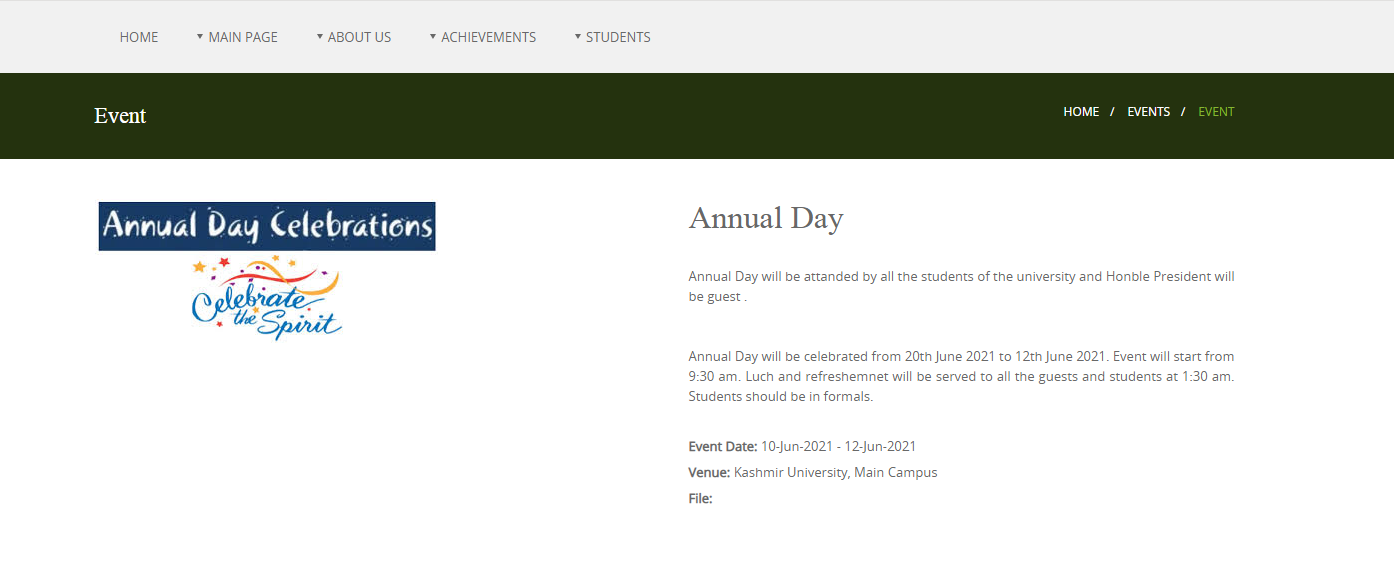Screenshot  showing an Event by the name Annual Day has been created on the website.