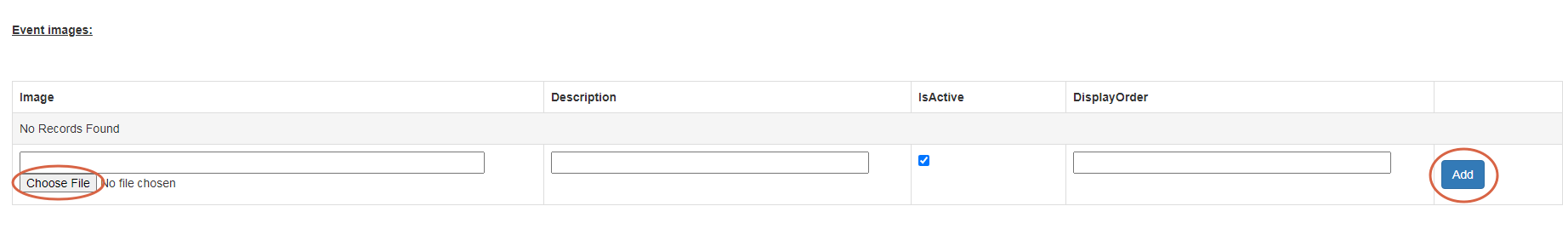 Once you have saved an event, Event Images table will appear beneath event details, wherein you can upload pictures of the event.