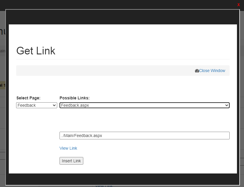 - Select Feedback in the Select Page drop down menu and select Feedback.aspx from Possible links